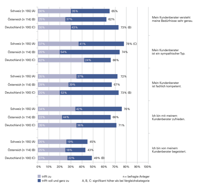 Dementsprechend verwundert es nicht, dass zwischen 40 und 60 Prozent der Befragten angeben, ihre Anlageentscheidungen bisweilen auch ohne ihren Kundenberater zu treffen. Da heisst aber nicht, dass vermögende Anleger grundsätzlich nichts von ihrem Berater halten – im Gegenteil.