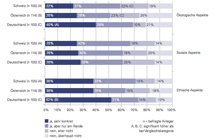 Soziale Aspekte waren bei rund einem Viertel der Befragten aller drei Länder konkret relevant. Und ethische Aspekte – zum Beispiel keine Investments in Waffen, Prostitution, Drogen oder gesundheitsschädliche Produkte wie Tabak oder Alkohol – waren 52 Prozent der deutschen Befragten wichtig, und damit deutlich mehr als den österreichischen (37 Prozent) und Schweizer Befragten (38 Prozent).