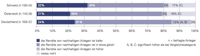 Exakt 32 Prozent der Schweizer Befragten sind der Ansicht, dass die Rendite von nachhaltigen Anlagen tiefer ist als bei traditionellen Anlagen (Österreich 21 Prozent, Deutschland 24 Prozent). Demgegenüber stehen 12 Prozent der deutschen Befragen, die glauben, dass die Rendite von nachhaltigen Anlagen höher ist als bei traditionellen Investments (Schweiz und Österreich nur je 3 Prozent).