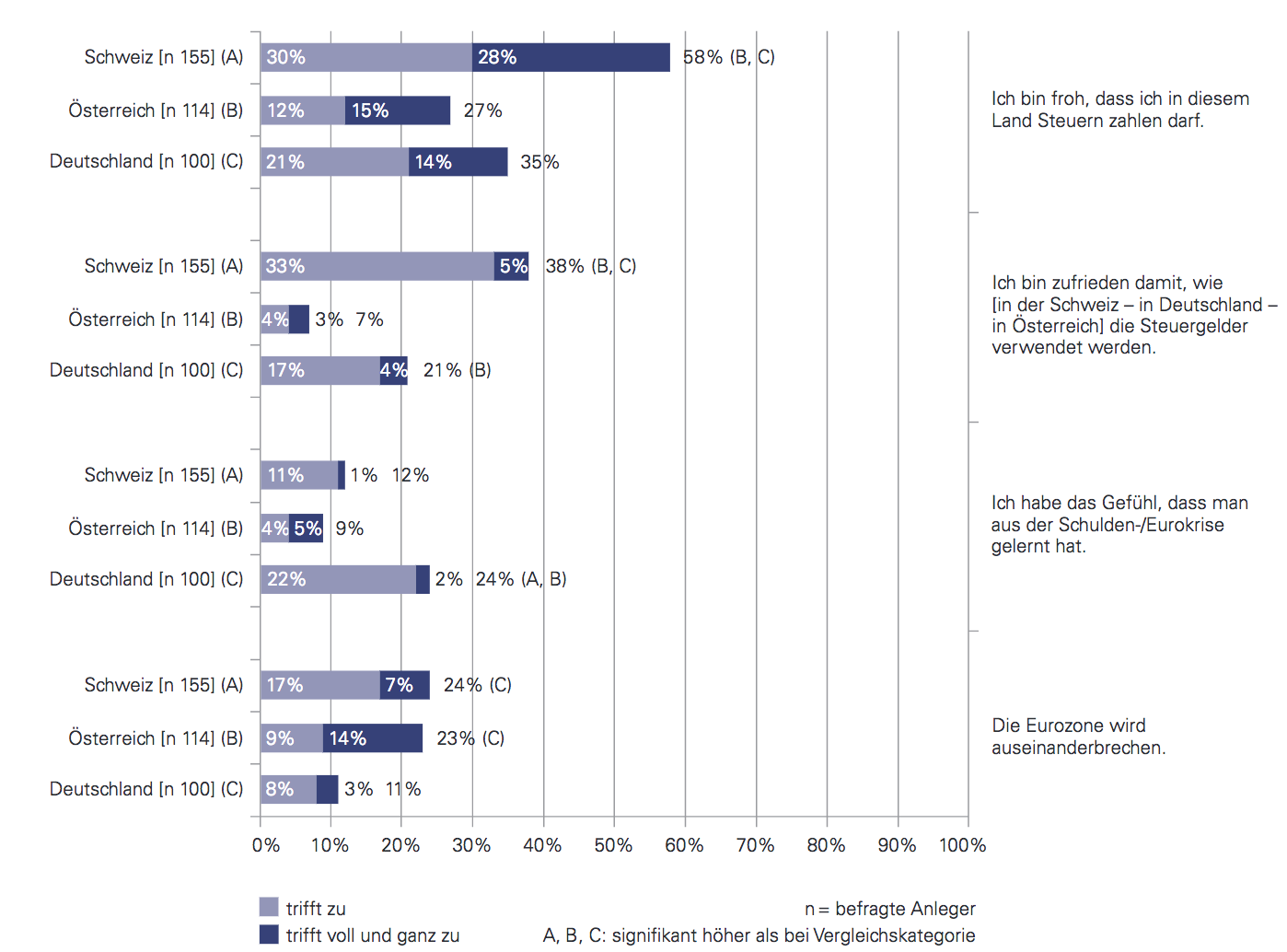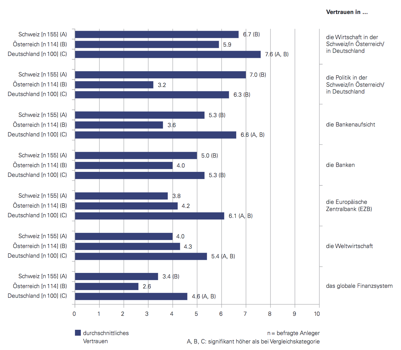 Letztere sehen die Finanzwelt wesentlich optimistischer, sie zeigen sich gegenüber Bankenaufsicht und globalem Finanzsystem als besonders vertrauensvoll. Und auch der Europäischen Zentralbank bringen sie ein durchaus beachtliches Vertrauen entgegen, während Schweizer und Österreicher der Institution skeptisch gegenüberstehen.