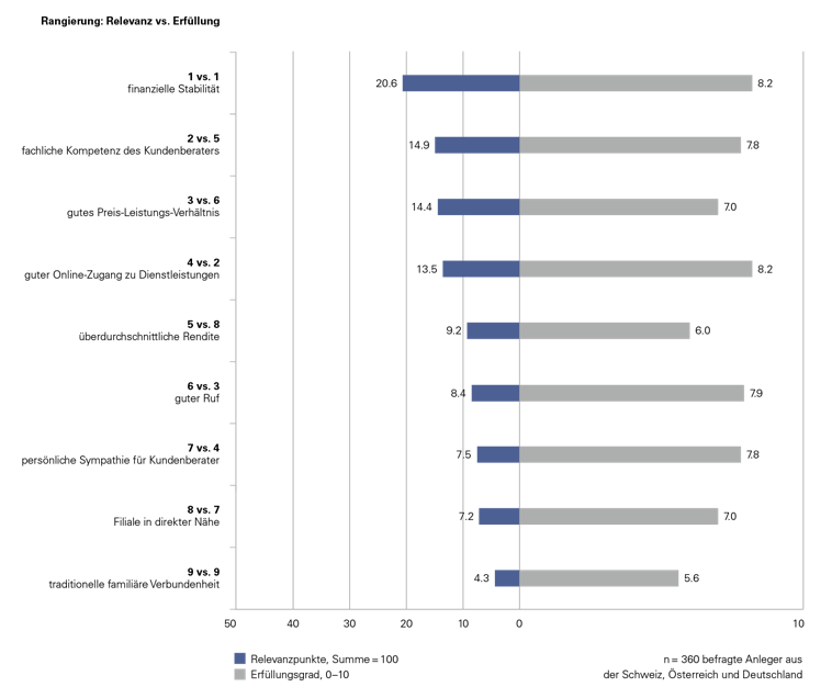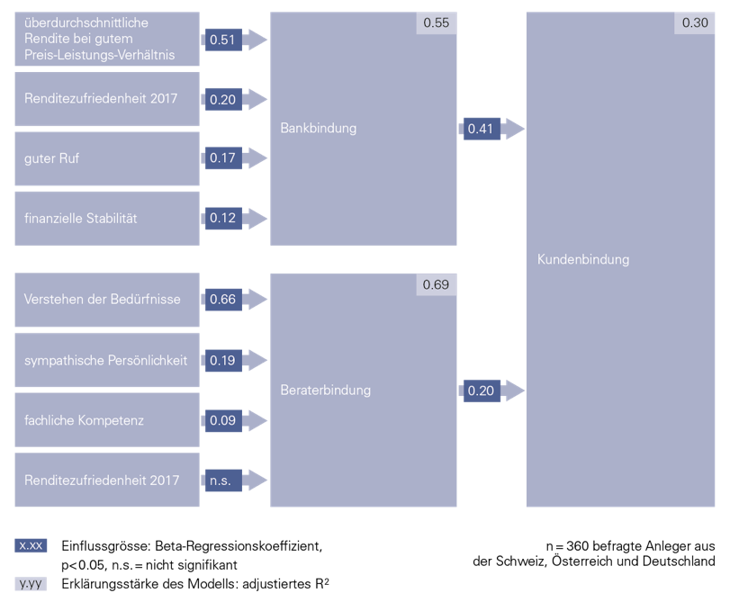 Daneben sind auch die Renditezufriedenheit und der gute Ruf der Bank relevant. Wenn es um die Bindung des Kunden an den Berater geht, spielt hingegen das Verständnis des Beraters für die individuellen Bedürfnisse des Kunden die grösste Rolle.