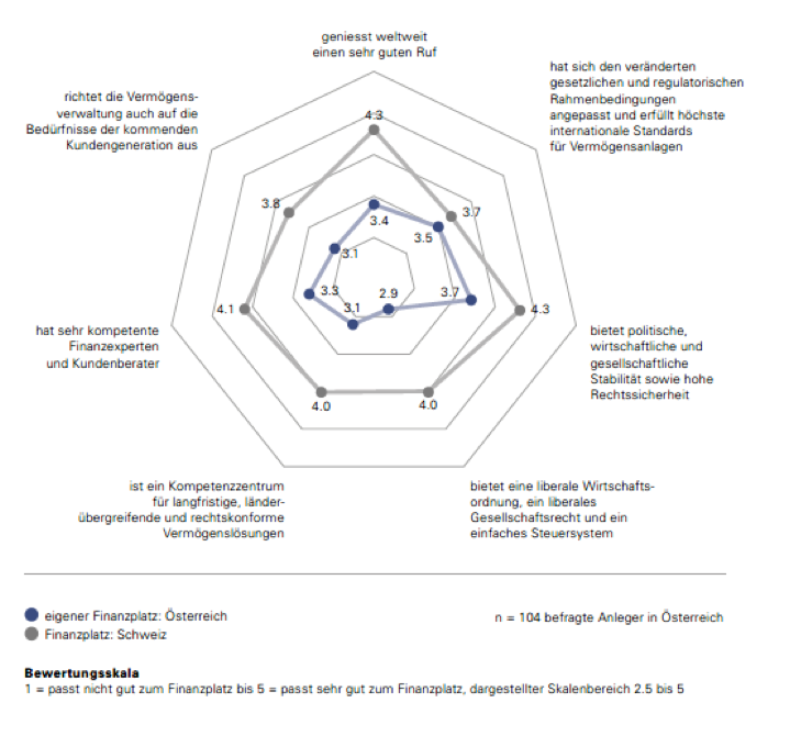 Die Studie untersuchte auch, wie die Anleger einzelne Finanzplätze beurteilen: Während die österreichischen Umfrageteilnehmer ihren Finanzplatz eher mittelmässig beurteilen, geben sie dem Schweizer Finanzplatz sehr gute Noten (vgl. Abbildung 3).