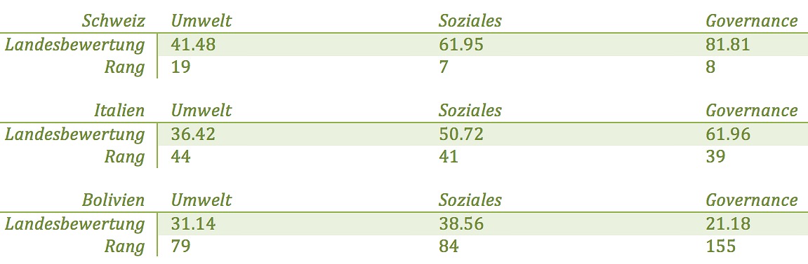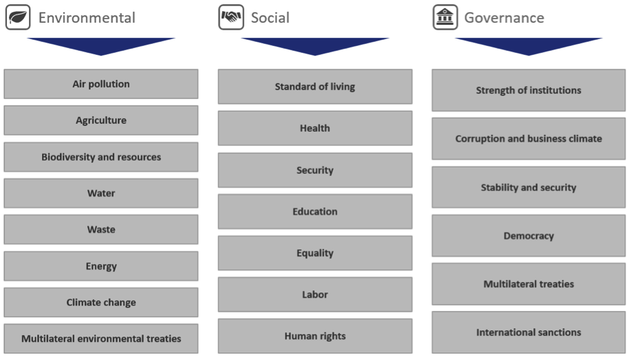 Im Bereich «Umwelt» können auf Länderebene beispielsweise Faktoren wie Kohleverbrauch, Naturschutzgebiete und Süsswasserkonsum von Bedeutung sein. «Soziales» beinhaltet unter anderem Aspekte wie Arbeitslosigkeit, Lebensstandard oder Mordrate, und «Governance» kann Kriterien wie unternehmerische Freiheit, politische Stabilität oder Patentanträge beinhalten.