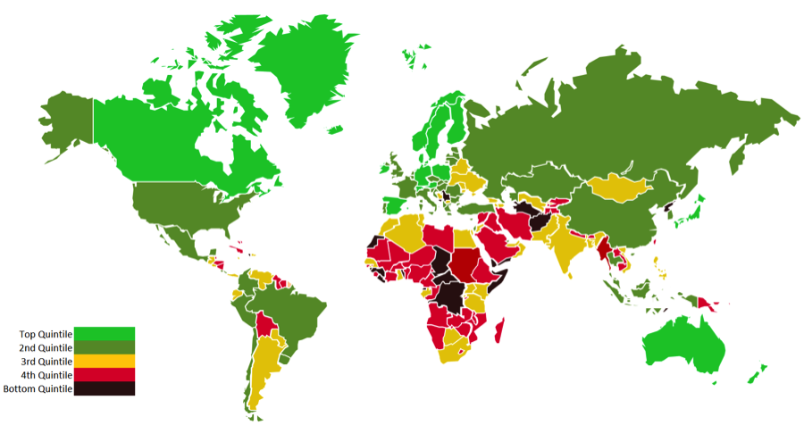 Wer sich selbst einen Überblick über den ESG-Entwicklungsstand einzelner Länder verschaffen möchte, dem bietet die folgende Übersichtskarte der Finanzdaten-Agentur «Bloomberg», welche die einzelnen Länder in fünf Nachhaltigkeits-Quintile einteilt, einen raschen Überblick.