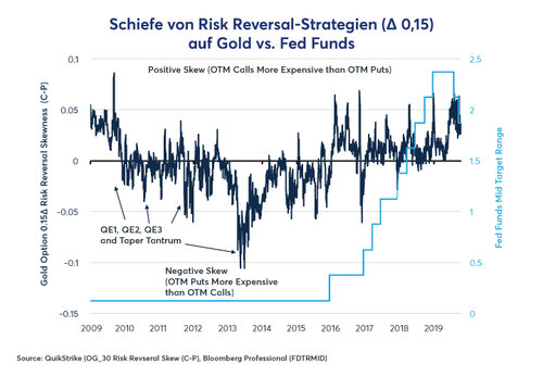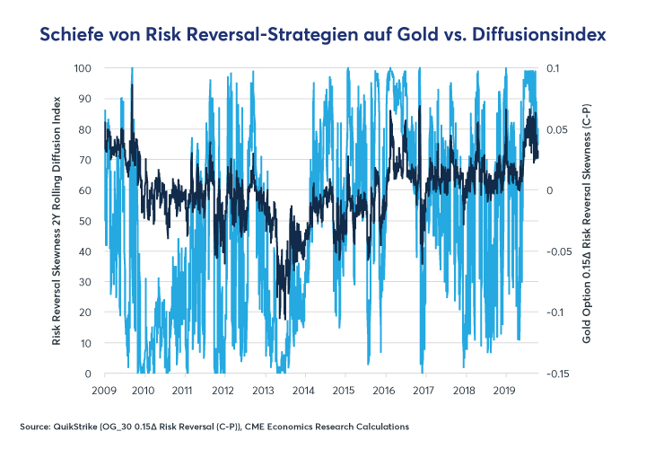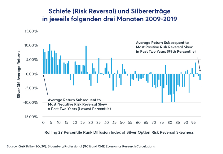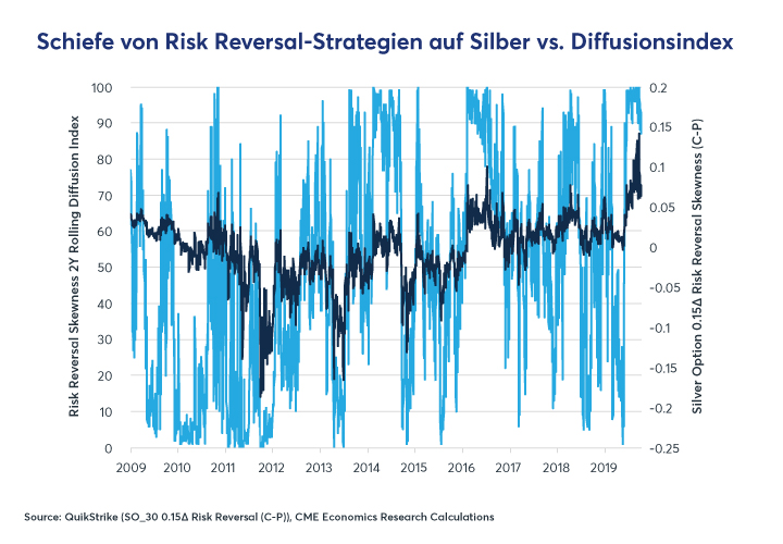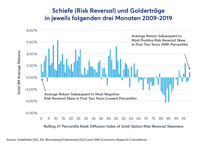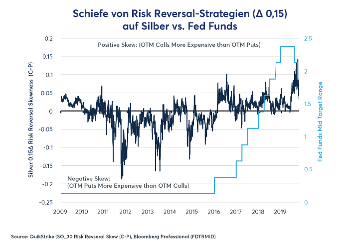 Am 11. Oktober 2019 befand sich die Risk Reversal-Schiefe von Goldoptionen mit Delta 0,15 weiterhin im 80. Perzentil, die der Silberoptionen ungefähr im 87. Perzentil. In den vergangenen zehn Jahren zogen ähnliche Perzentilwerte der Schiefe in den folgenden drei Monaten oftmals einen Rückgang des Goldkurses um 2 bis 4 Prozent sowie des Silberkurses um 4 bis 10 Prozent nach sich.