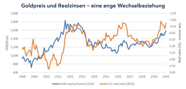 Ein Blick auf die Entwicklung des Goldpreises seit der Finanzkrise zeigt, dass dessen Schwankungen häufig mit Veränderungen der Realzinsen einhergehen: Der Goldpreis steigt, wenn die realen Renditen fallen – und umgekehrt. Die Realverzinsung wird üblicherweise anhand der 10-Jahres-Treasury-Renditen (im Wesentlichen ein Renditemassstab für risikofreie Wertpapiere) abzüglich der Inflationsrate definiert.