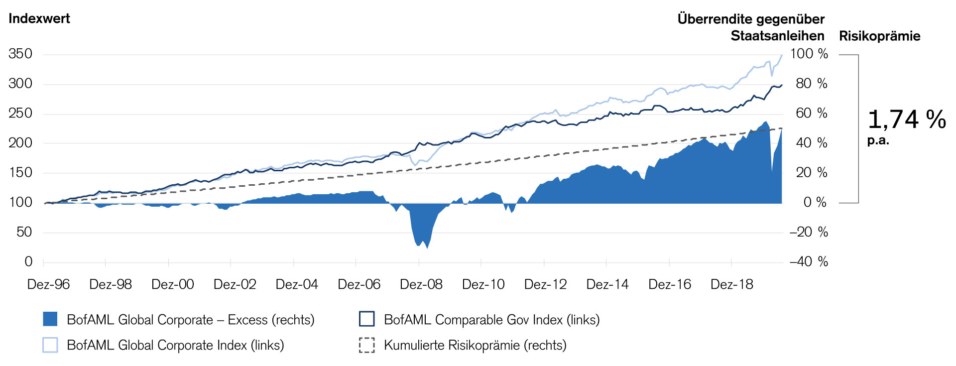 Unternehmensanleihen bieten eine attraktive, langfristige Risikoprämie. Im aktuellen Niedrigzinsumfeld hat die Erwirtschaftung der Kreditrisikoprämie zusätzlich an Bedeutung gewonnen. Dabei ist die Erwirtschaftung der Prämie nicht risikofrei.