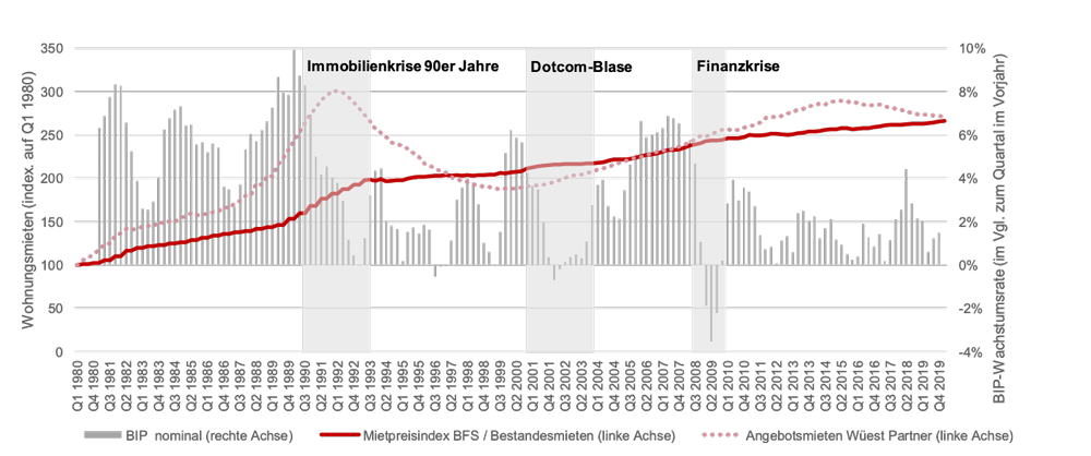 Die Resistenz der Bestandsmieten kann mit der Analyse der Immobilienkrise der 1990er-Jahre unter Beweis gestellt werden. Auch diese schwierige Phase hinterliess bei den Bestandsmieten kaum Blessuren.