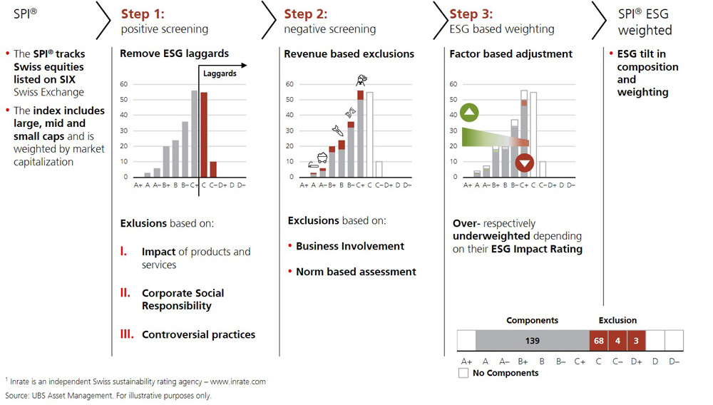 Ausgehend vom klassischen SPI® Index erfolgt ein Prozess in drei Schritten, bis der SPI® ESG Weighted Total Return Index zusammengestellt ist.