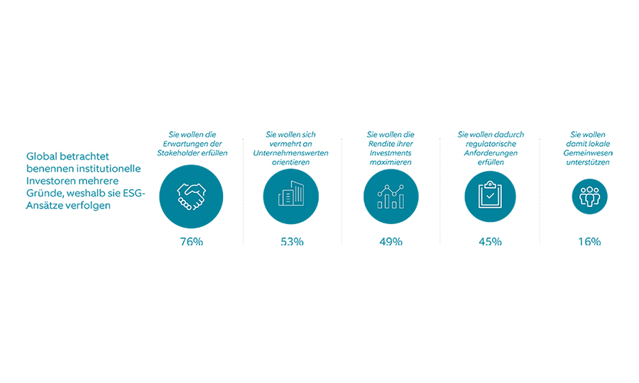 Exakt 76 Prozent der institutionellen Investoren verfolgen verantwortungsbewusste Anlagestrategien, um dadurch die Erwartungen ihrer Stakeholder zu erfüllen. 53 Prozent wollen sich besser an den Unternehmenswerten orientieren und 49 Prozent möchten sich auf ESG konzentrieren, um die Anlagerendite zu maximieren.