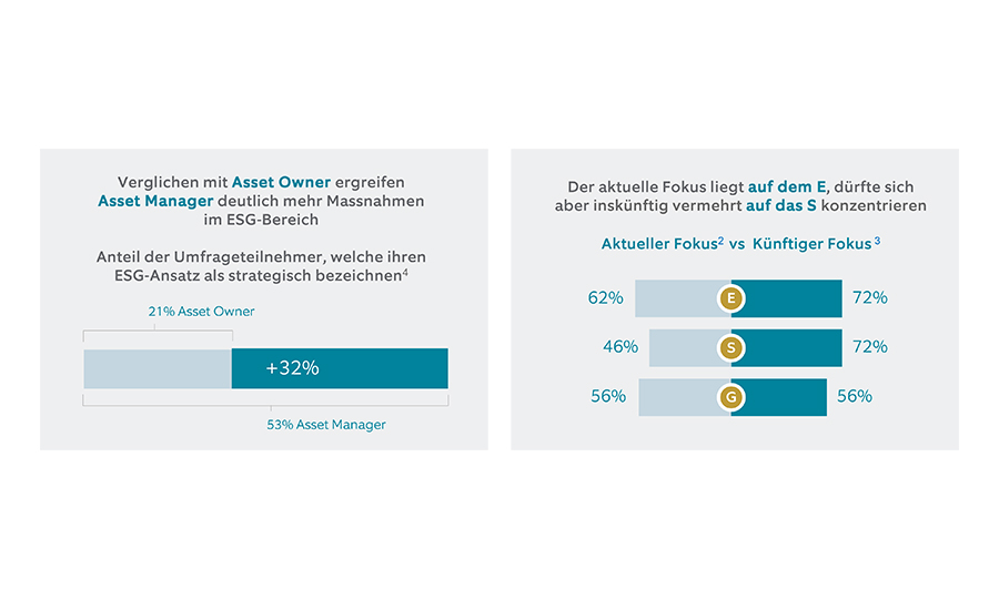 Es ist allerdings interessant und durchaus erwähnenswert, dass ein Grossteil der Aktivitäten der Asset Manager als Reaktion auf den verstärkten Fokus ihrer Kunden beziehungsweise deren Investoren betrachtet werden kann2. Während 62 Prozent der Befragten sich derzeit am meisten auf das «E» im ESG-Kontext konzentrieren, wird erwartet, dass der Fokus auf das «S» in naher Zukunft am stärksten zunehmen dürfte (vgl. nachstehene Abbildung rechts).