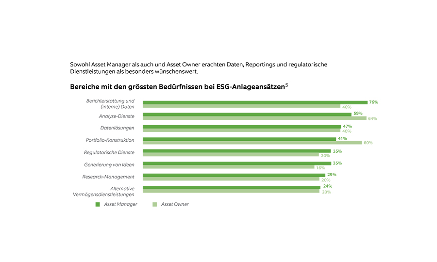 Auf die Frage, welches die wichtigsten Erfordernisse für ESG-konforme Investment-Praktiken sind, nannten 76 Prozent der Asset Manager interne Reports und Daten. Rund 40 Prozent der Asset Owner stimmten dieser Aussage zu (vgl. nachstehende Abbildung).