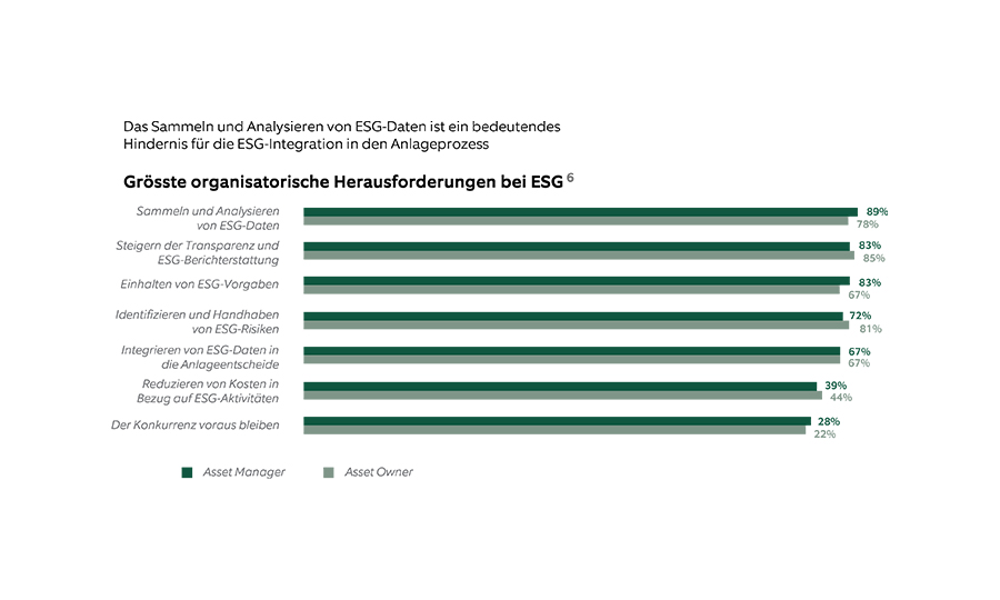 Auf die Frage nach den grössten Herausforderungen bei der Einbeziehung verantwortungsbewusster Vorgehen in ihren Investment-Prozessen nannten die Befragten vor allem das Sammeln und Analysieren von Daten, die Verbesserung der Transparenz und Berichterstattung sowie die Einhaltung von Anlagevorschriften (vgl. nachstehende Abbildung).