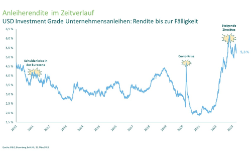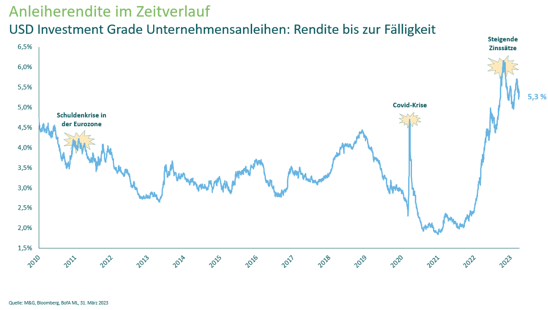 Nach dieser Marktkorrektur ist die Ausgangslage für Anleiheinvestoren heute so günstig wie schon lange nicht mehr. Sie können jetzt eine Rendite von rund 5,3 Prozent erzielen, wenn sie in US-Unternehmensanleihen mit Investment-Grade-Rating investieren; also in Titel mit hoher Qualität.