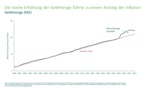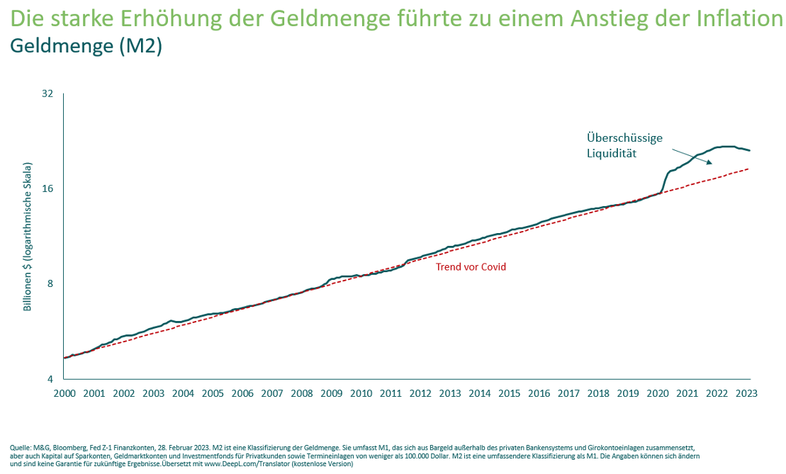 Die hohen Ersparnisse der privaten Haushalte haben dazu geführt, dass die Verbraucher bisher recht widerstandsfähig waren. Unserer Meinung nach wird eine Verringerung der Geldmenge jedoch letztlich zu einer sinkenden Inflation führen – die Richtung stimmt also.