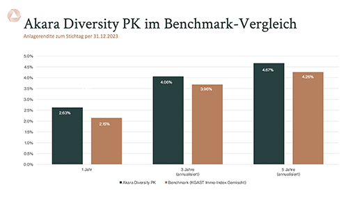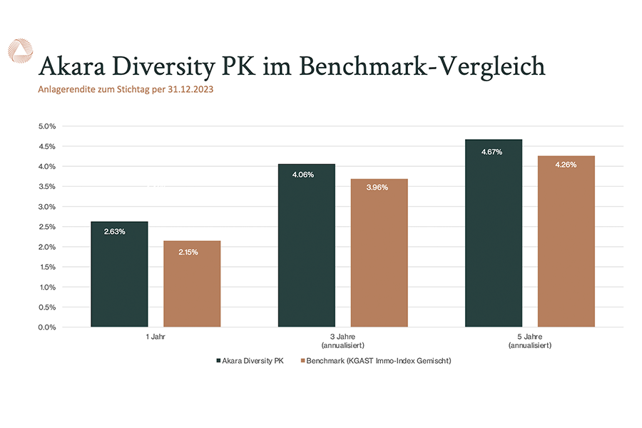 Mit einem Gesamtanlagevermögen von 2,7 Milliarden Franken, einer erneuten Outperformance gegenüber dem KGAST Immo Index gemischt von 0,48 Prozent für 2023 und realisierten Kapitalgewinnen von 7,8 Millionen Franken hat der Akara Swiss Diversity Property Fund PK seine Resilienz und Attraktivität für Anleger auch im vergangenen Jahr eindrucksvoll unter Beweis gestellt.