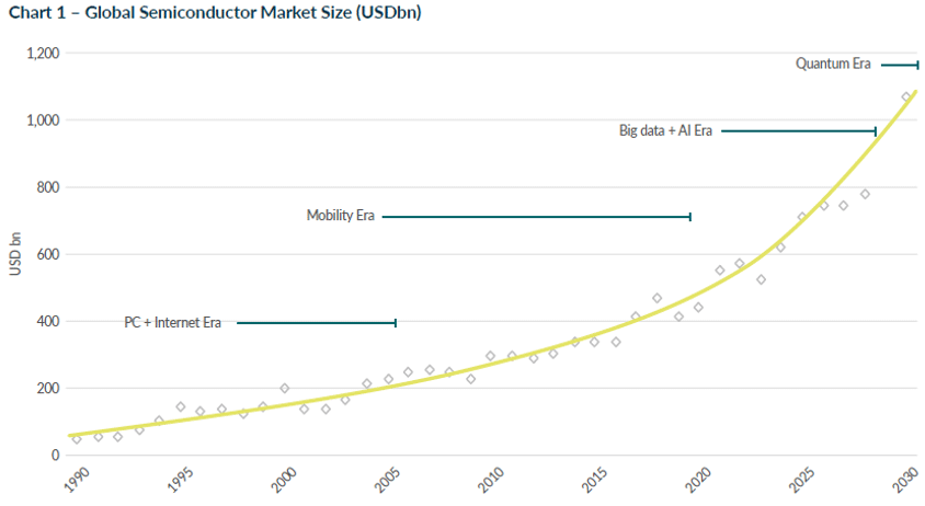 Bis 2030 könnte die Nachfrage nach mehr und immer leistungsfähigeren Halbleiterchips den Umsatz der weltweiten Halbleiterindustrie von heute 500 Milliarden Dollar auf eine Billion Dollar ansteigen lassen.1 Wie die nachstehende Grafik zeigt, hat der Markt mehr als 50 Jahre gebraucht, um diesen Punkt zu erreichen.