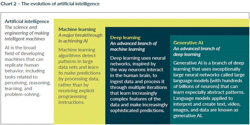 Wie können wir dem oben dargestellten Umsatzwachstum überhaupt Rechnung tragen? Gen-KI ist eine Form des maschinellen Lernens, bei der Muster in Trainingsdaten verwendet werden, um neue Texte, Videos, Bilder, Codes oder Musik zu erzeugen, die sich möglicherweise nicht von dem unterscheiden, was Menschen schaffen können.