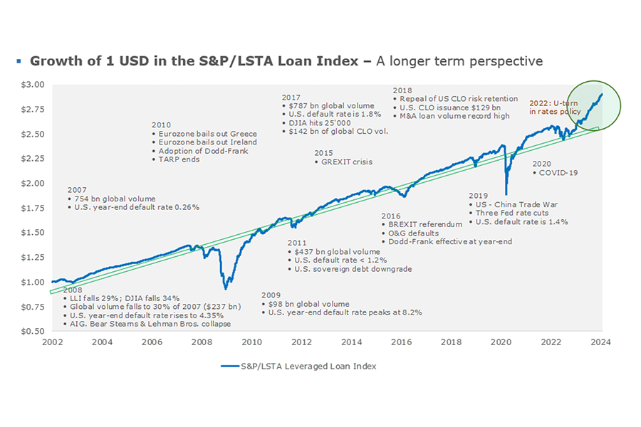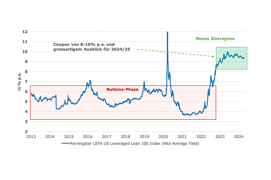 Sollte auf der anderen Seite der Wirtschaftsmotor munter weiter summen, werden die Zinsen mehr oder weniger das hohe Niveau halten, die Unternehmensausfall-Raten moderat bleiben und so ebenfalls zu äusserst attraktivem Zinseinkommen führen, wie dies am Beispiel von «Senior Secured Loans» zu sehen ist, wo der Rendite-Ausblick derzeit bei 8-10 Prozent per annum liegt.