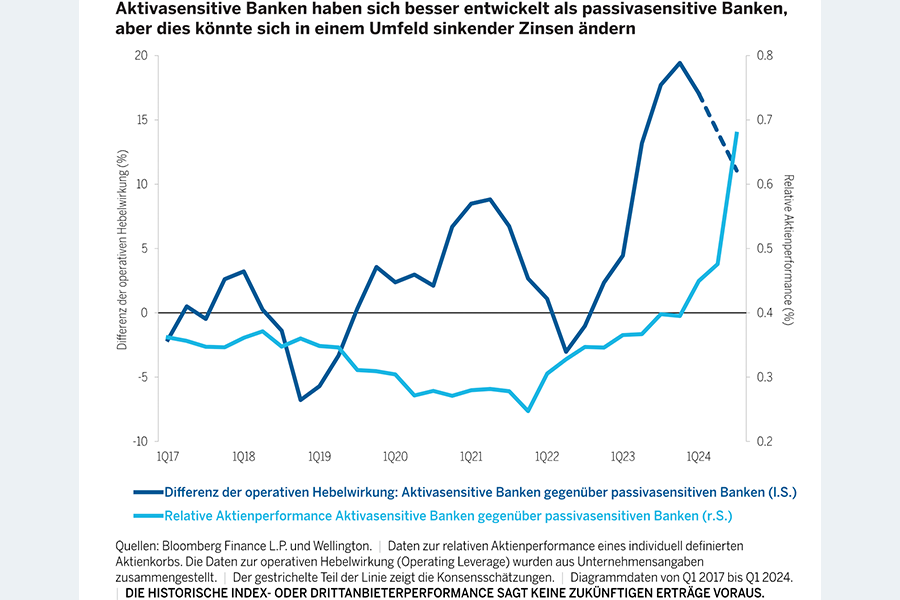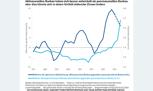 Ich bin jedoch der Ansicht, dass sie in einem Umfeld sinkender Zinsen mit einem höheren Gewinnwachstum und einer robusten Rentabilität rechnen können. Aus diesen Gründen gehe ich davon aus, dass das Risiko-Rendite-Profil von Banken mit einer höheren Passivasensitivität in den nächsten drei bis fünf Jahren besser sein wird als das ihrer aktivasensitiven Pendants.
