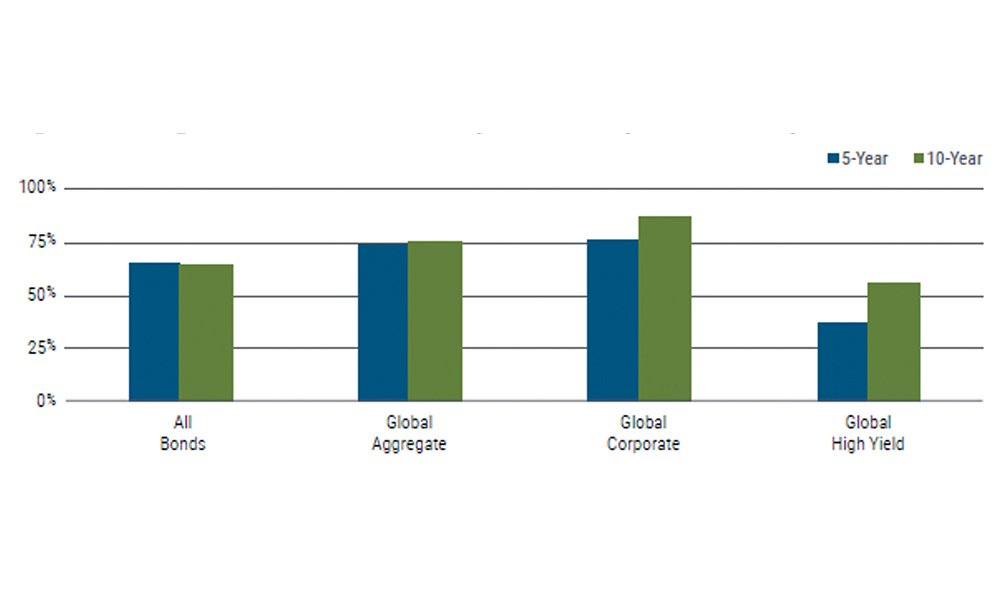 Das Ergebnis zeigt erneut: Aktives Management übertrifft passives Management. Detaillierte Ergebnisse haben wir nachstehend zusammengefasst: Mehr als 60 Prozent der aktiv verwalteten globalen Obligationenfonds ex-USA1 nach Abzug der Gebühren langfristig besser abschnitten als der Median ihrer passiven Pendants. Das heisst, dass Anleger, die sich für eine aktive Obligationenlösung entschieden haben, im vergangenen Jahrzehnt eine mehr als 60-prozentige Chance genossen, passive Alternativen zu übertreffen.