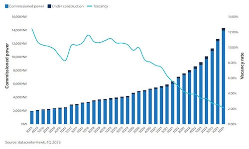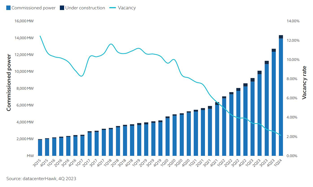 Die Rechenzentrumskapazitäten steigen zwar schnell an – aber nicht so schnell wie die Nachfrage. Infolgedessen befinden sich die Leerstandsquoten auf einem historischen Tiefstand und die Mieten steigen weiter an.