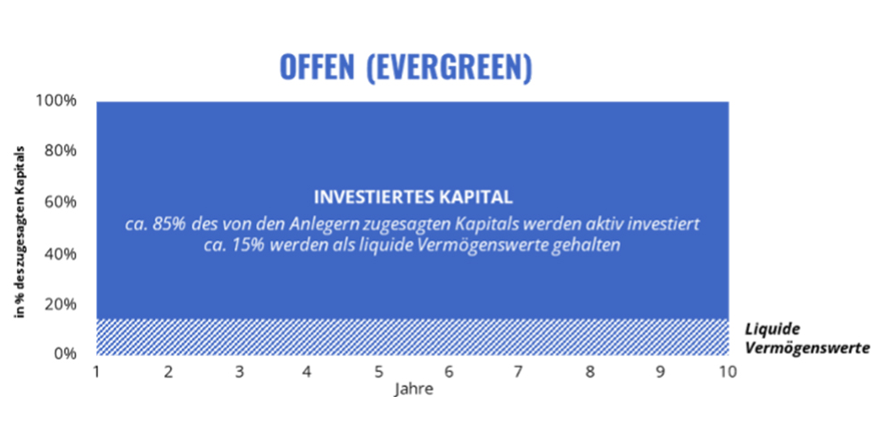 Da die Evergreen-Fonds vom ersten Tag an vollständig abgerufen werden, wird der gesamte zugesagte Betrag sofort investiert. Das Kapital wird nicht nur sofort eingesetzt, sondern die Ausschüttungen werden auch mit demselben jährlichen Renditeziel reinvestiert, so dass die Anleger in den vollen Genuss des Zinseszinseffekts ihrer von einem Expertenteam verwalteten Anlagen kommen.