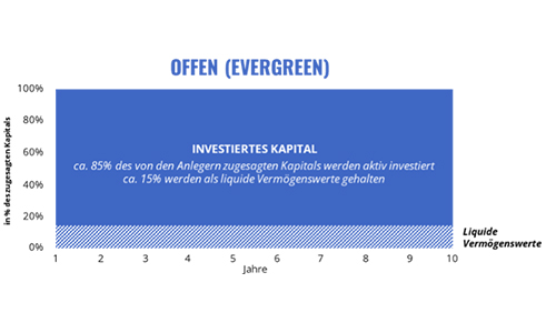 Die Struktur dieser Fonds ermöglicht auch ein sofortiges Engagement in privaten Unternehmen vom ersten Tag an und die Beibehaltung einer konsistenten Zielallokation in dieser Anlageklasse. Im Gegensatz zu geschlossenen Fonds, die über den Anlagezeitraum (in der Regel die ersten fünf Jahre der Fondslaufzeit) schrittweise Verpflichtungen eingehen, können Anleger bei Evergreen-Fonds ihr Kapital sofort vollständig einsetzen. So können die Anleger ohne Verzögerung von einem Portfolio profitieren, das zum Zeitpunkt der Investition bereits bekannt ist.