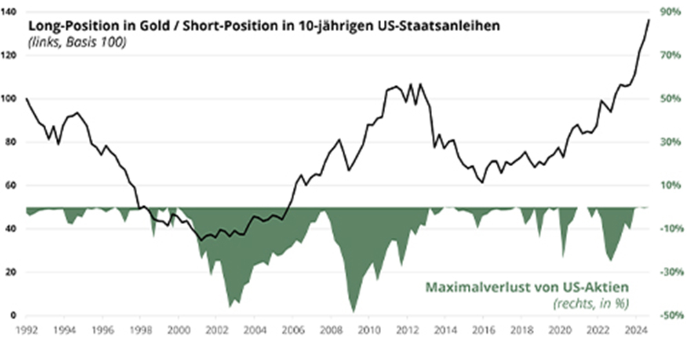 Die schwarze Linie in der obigen Grafik entspricht der Wertentwicklung eines Investments, bei dem Gold gekauft und eine 10-jährige US-Anleihe verkauft wurde. Bei einem solchen Investment handelt es sich um eine Absolute-Return-Strategie. Sie hat sich in risikoaversen Phasen äusserst positiv entwickelt: +100 Prozent während des Platzens der Internetblase oder +30 Prozent im Inflationsjahr 2022, in dem es die gesamte Underperformance von Aktien ausglich, als dies am nötigsten war.