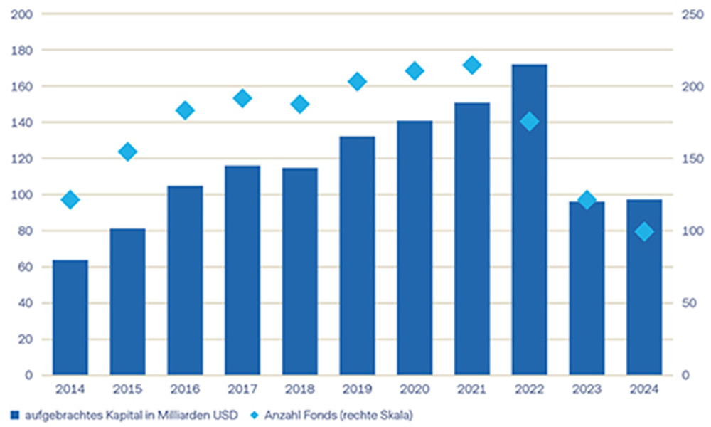 Quelle: Preqin. Jahreszahlen von 2014 bis Ende 2024. Illustration: Zurich Invest. Hinweis: Die vergangene Performance ist kein Indikator für zukünftige Ergebnisse.