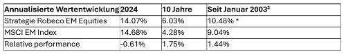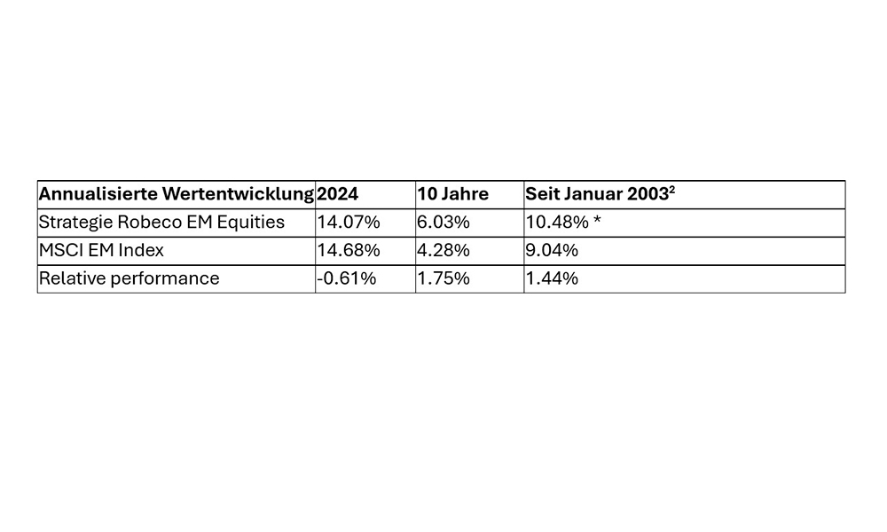(Zum Vergrössern, Tabelle einfach anklicken; Quelle: Robeco, MSCI. Portfolio: Strategie Robeco Emerging Markets Equities. Index: MSCI Emerging Markets Index. Indexwechsel zum 01.01.2008 vom S&P IFC Composite zum MSCI Emerging Markets Index. Alle Angaben in EUR. Stand der Daten: Ende Februar 2025.)