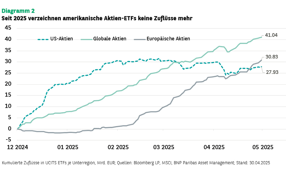 Die Trends zu Beginn des Jahres 2025 zeigten eine klare Tendenz zu US-amerikanischen und globalen Aktien. Ab Februar verzeichneten US-Aktien jedoch Abflüsse, die sich im März und April fortsetzten.