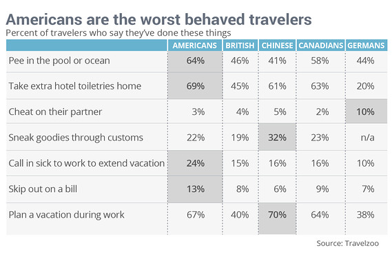 Wenn es Sie auf dem Business-Trip mit Amerikanern ins gleiche Hotel verschlägt, dann machen Sie besser einen Bogen ums Becken. Warum, lässt sich einer Statistik entnehmen, welche laut dem Portal «Marketwatch» bei 9'500 Reisenden durchgeführt wurde (siehe Tabelle unten).