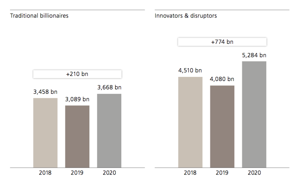 In Zahlen ausgedrückt: Zwischen 2018 und Juli 2020 haben die Vermögen von Innovatoren und Disruptoren, wie die UBS sie nennt, um 774 Milliarden Dollar zugenommen. Traditionelle Milliardärsvermögen wuchsen demgegenüber «nur» um 210 Milliarden Dollar (siehe Grafik unten). Am langsamsten entwickelten sich zuletzt die Gelder aus den Bereichen Finanzwesen, Rohstoffe und Medien.