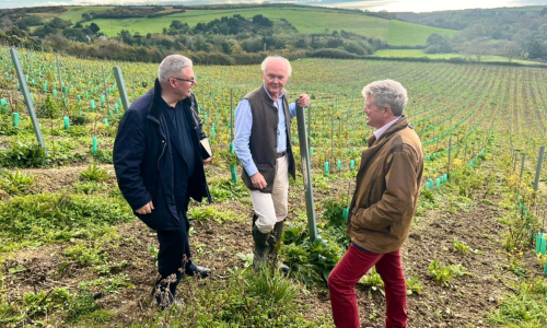 Terra Incognita auf der Isle of Wight: Philipp Schwander (links) mit Nicholas Coates und Christian Seely (rechts) im neuen Weinberg. (Bild: zVg)
