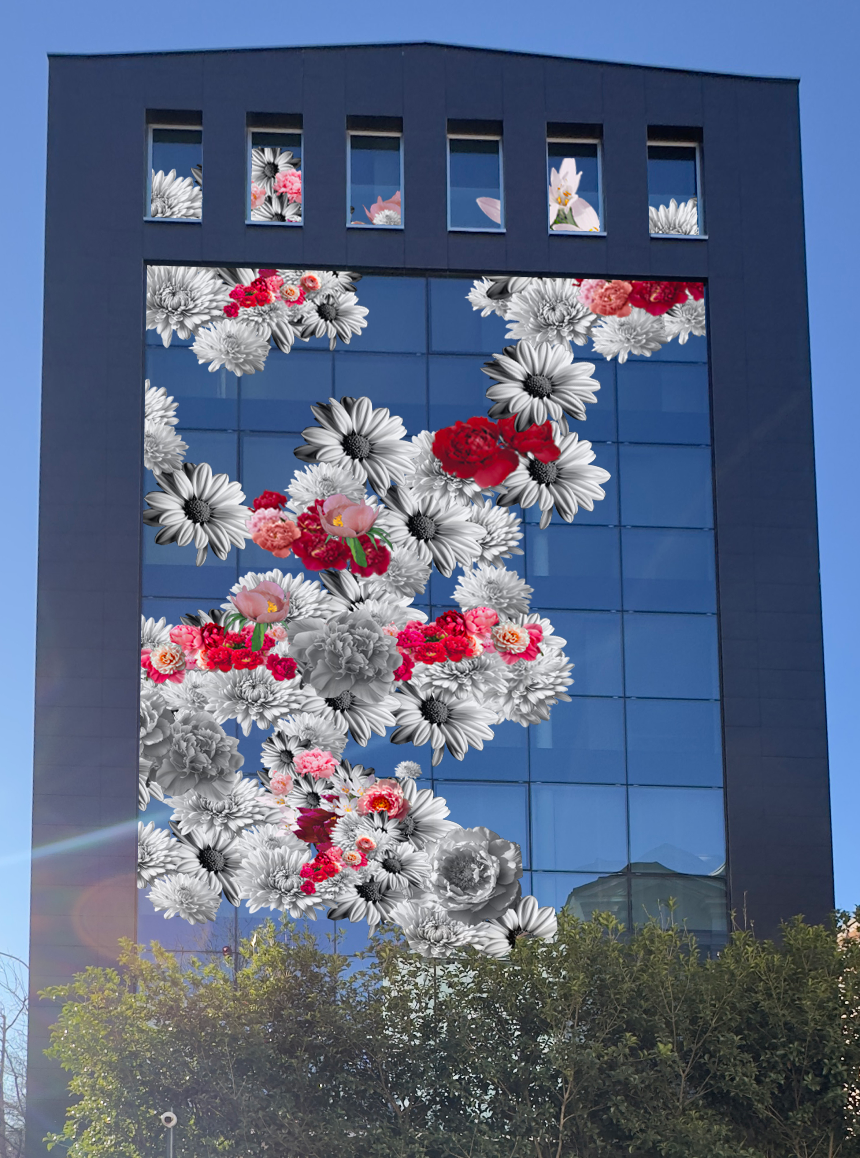 Die Blumen, in Farbtönen von intensivem Rot bis zu zartem Rosa gehalten, symbolisieren Energie, Entschlossenheit, Sanftheit und die Offenheit zusammenzuarbeiten – Werte, welche die Unternehmenskultur der Bank Credinvest und die Mission des Werks widerspiegeln.