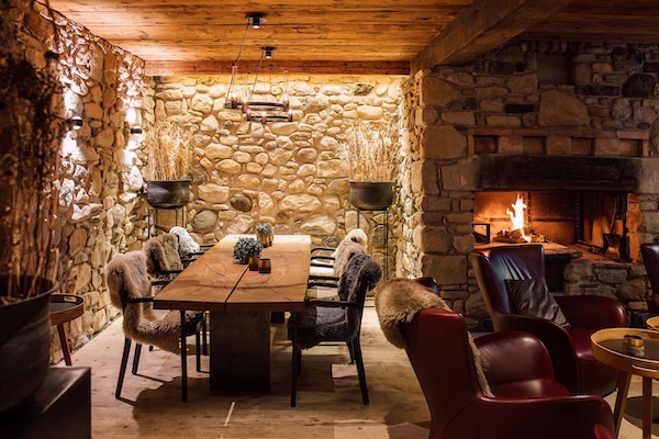 Im wuchtigen Kamin prasselt ein Feuer; der Blick wandert hin und her zwischen den flackernden Flammen, den einladenden Ledersesseln und dem durch eine Glaswand abgetrennten Weinkeller-Gewölbe, in dem hölzerne Kisten verführerisch beleuchtet aufgereiht sind.