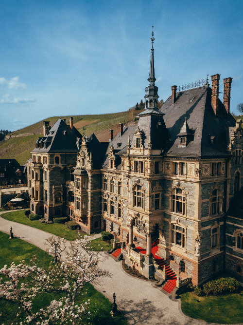 Und ich finde, das Schloss Lieser bietet das perfekte Ambiente für den «101 Selection Day». Das Hotel liegt unterhalb der Weinberge, die Mosel ist in Sichtweite. Zwei unterschiedliche Architekturstile verleihen dem Gebäude die Anmutung eines Märchenschlosses. Eduard Puricelli, ein Unternehmer aus dem Hunsrück, ließ es von 1884 bis 1887 im Stil der Neorenaissance bauen. Um die Jahrhundertwende erweiterten Puricellis Tochter Maria und ihr Ehemann das Schloss um einen Anbau im Jugendstil. Mir gefällt dieses architektonische Nebeneinander, das sich auch im Gebäude fortsetzt.