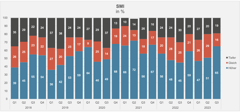 Nel complesso, gli intervistati sono sorprendentemente ottimisti sull'andamento dei mercati finanziari, come lo erano alla fine dell'anno. Non meno del 65% dei gestori patrimoniali prevede un aumento dello Swiss Market Index (SMI). In confronto, nell'ultimo trimestre era solo il 51% (vedi grafico sotto).