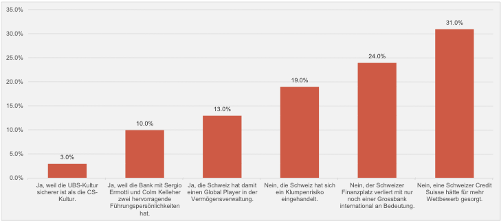La maggior parte dei gestori patrimoniali indipendenti in Svizzera è critica nei confronti della «futura» UBS: il 24,0% degli intervistati ritiene che la piazza finanziaria svizzera con una sola grande banca svizzera stia perdendo la sua importanza internazionale. Ben il 31,0% ritiene che senza Credit Suisse (CS) non ci sia più abbastanza concorrenza nel Paese (cfr. grafico sotto).