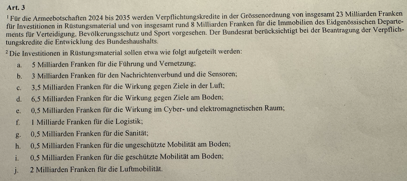 Alla fine, però, il Consiglio federale, nella sua seduta del 14 febbraio 2024, ha eliminato proprio l’articolo della decisione governativa che specificava il piano per gli impegni di spesa fino al 2035, pari a un totale di 23 miliardi di franchi.