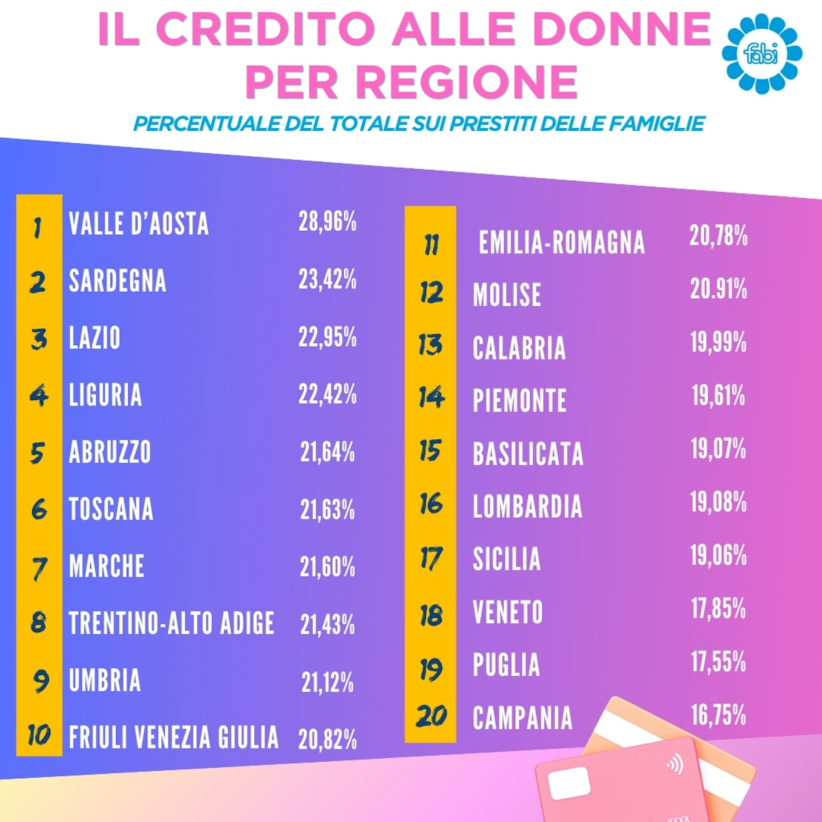 Chi dà più spazio nel credito alle donne continua ad essere, in assoluto, la Valle d'Aosta, con quasi il 25% dei prestiti concessi in favore della clientela femminile, superiore oltre cinque punti base rispetto alla media nazionale del 19,98%.