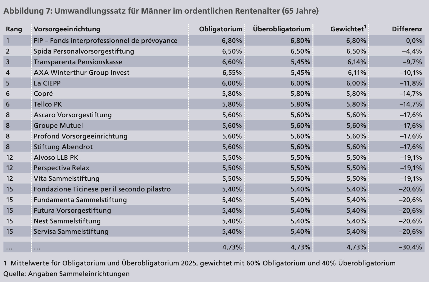 VZ afferma inoltre che, rispetto allo scorso anno, le aliquote di conversione sono state ridotte in media dal 5,64% al 5,53%. Nella sua classifica, VZ ha confrontato solo le aliquote di conversione del 2025 per uomini in età ordinaria di pensionamento.