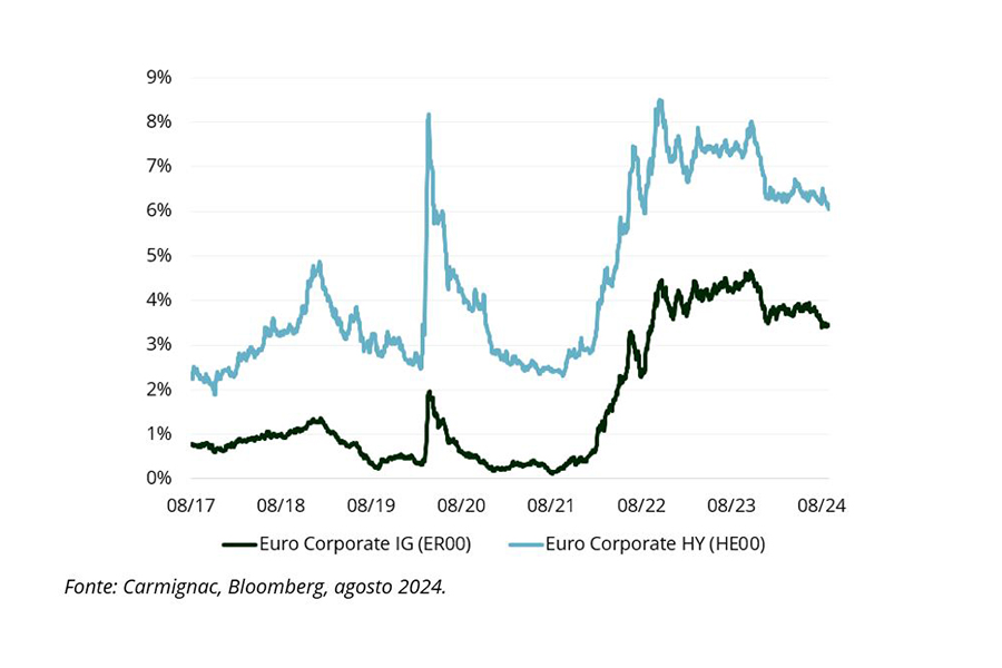 L'asset class del credito sta beneficiando della tenuta dell’economia statunitense ed europea, che consente alle aziende di mantenere una crescita robusta. Dopo lo shock obbligazionario del 2022, gli investitori hanno favorito il credito, contribuendo all'erosione dei margini dell'asset class.
