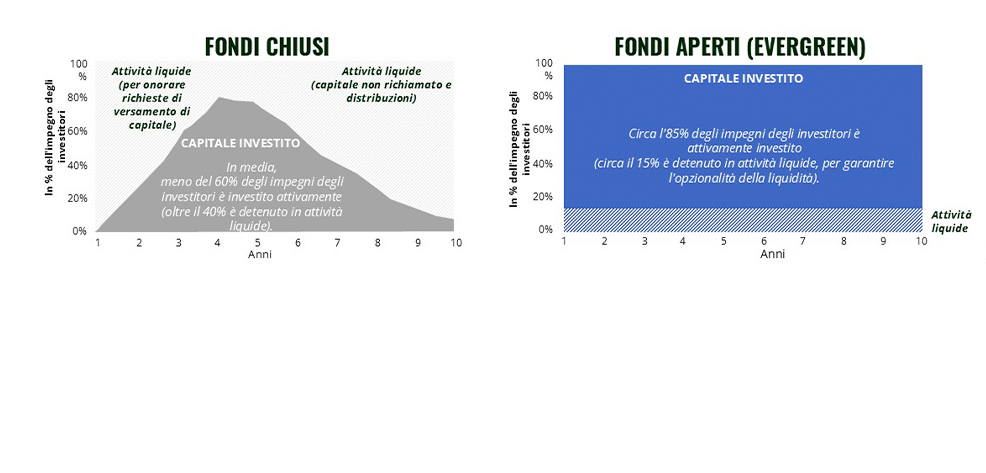 Con un fondo evergreen, il 100% del capitale viene richiamato fin dal primo giorno: gli investitori sono immediatamente esposti a un portafoglio di società private e possono beneficiare dell'apprezzamento degli investimenti già effettuati nel fondo.